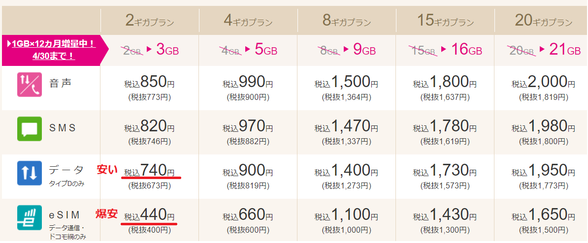 なんと3GBのeSIMデータSIMなら音声の約半額と圧倒的な安さです。