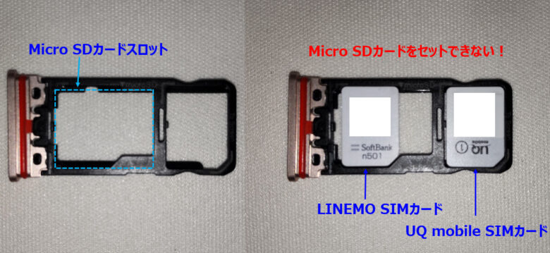 タイプ1の場合、SIMカードを2枚入れるとMicro SDカードが入りません。
