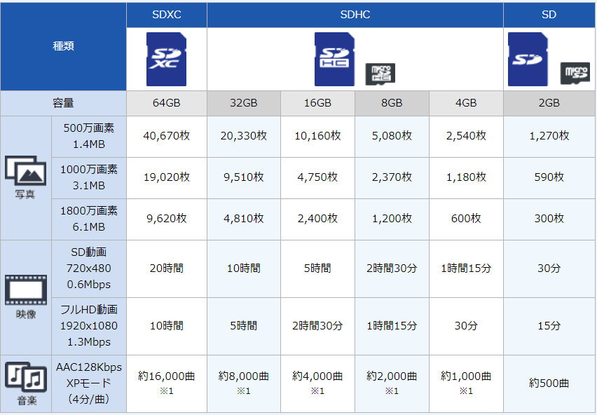 大きな違いはデータ容量で、「SD」<「SDHC」<「SDXC」の順に容量が増えていきます。